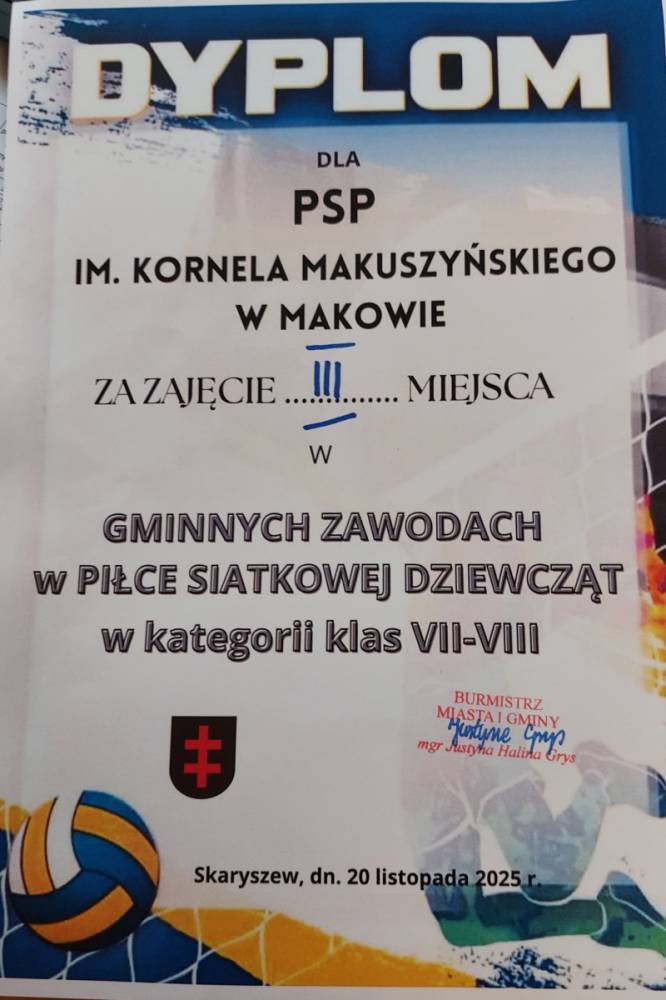 Dnia 20 listopada 2025 r. nasza reprezentacja dziewcząt z klasy VII i VIII dzielnie walczyła podczas gminnych zawodów siatkarskich.