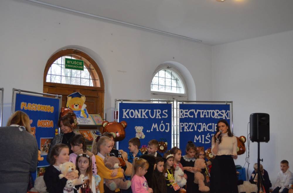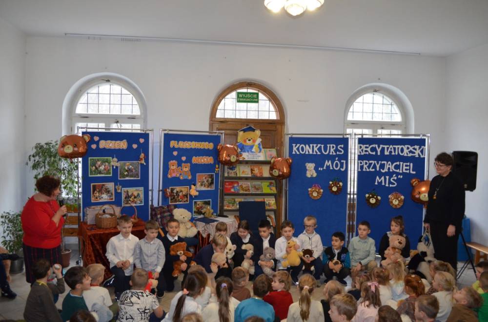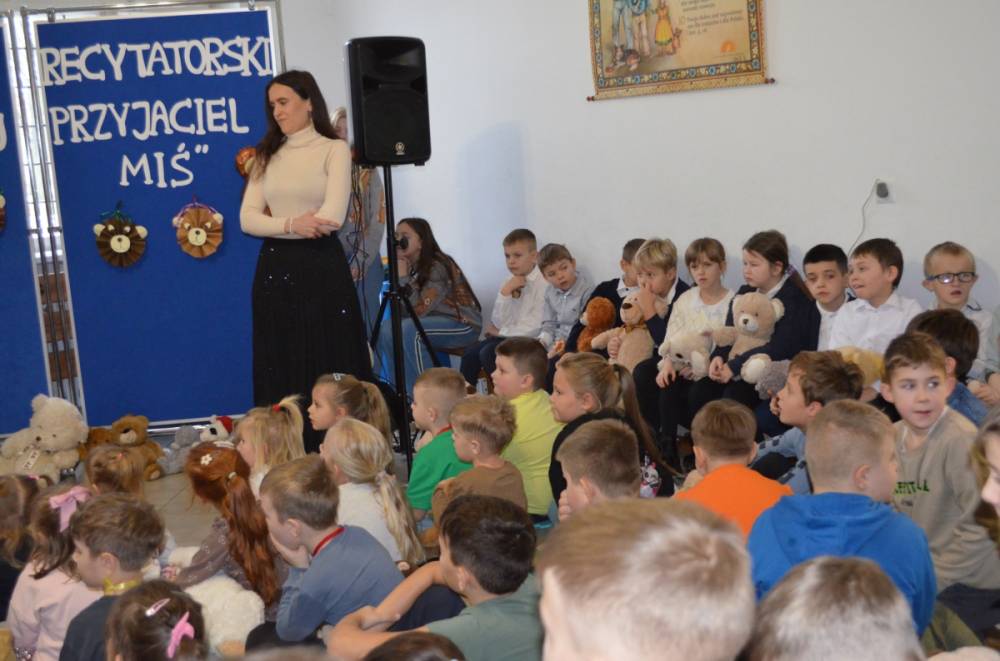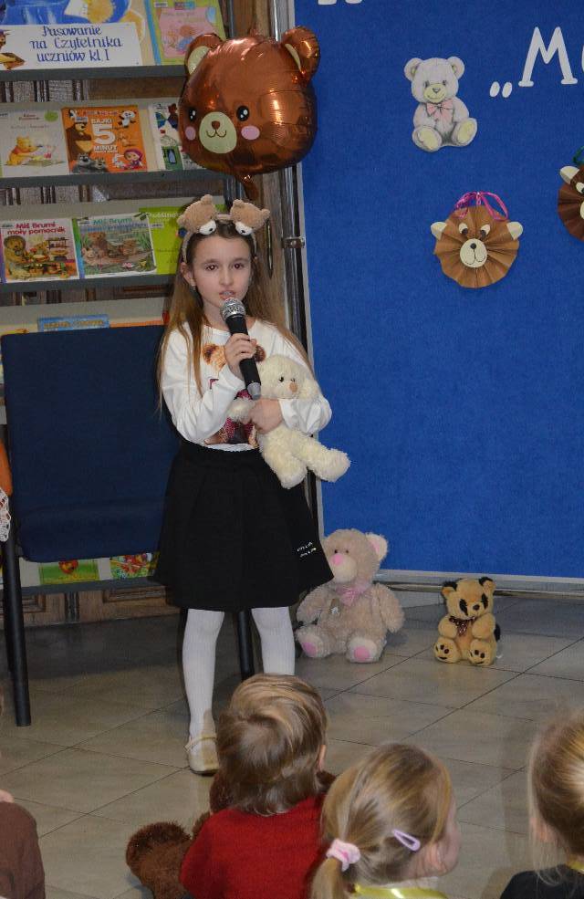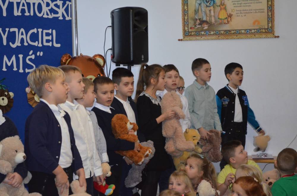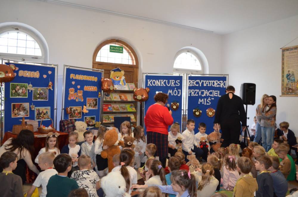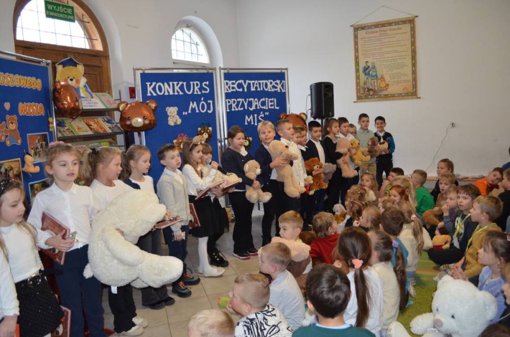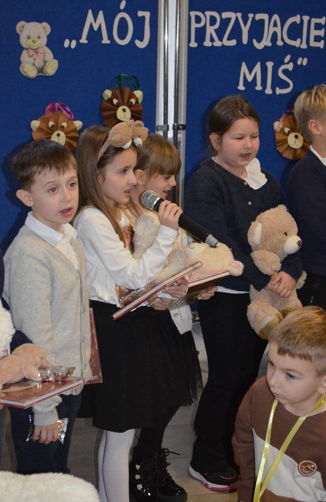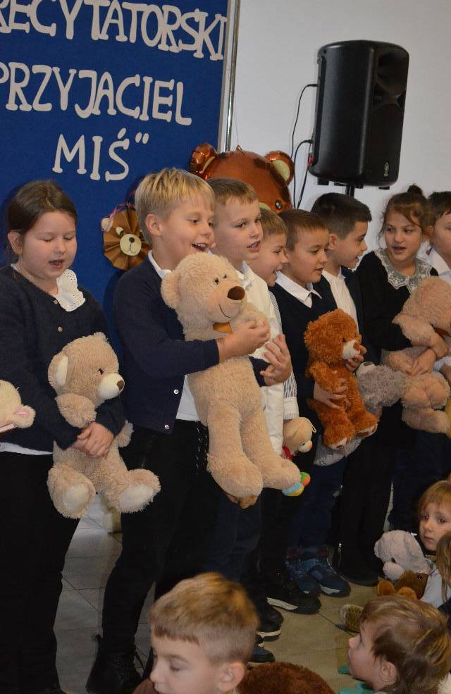 Dzieci z klas 0-3 i ich misie przybyły na świętowanie razem z Panią Dyrektor, Komisją Konkursową oraz swoimi Wychowawczyniami. Na początek wspólnie odśpiewano misiowy hymn „Pokochaj Pluszowego Misia”, następnie odbył się konkurs recytatorski pt. „Mój przyjaciel Miś”. Powołana komisja uważnie wysłuchała wszystkich występów i wybrała najlepsze.