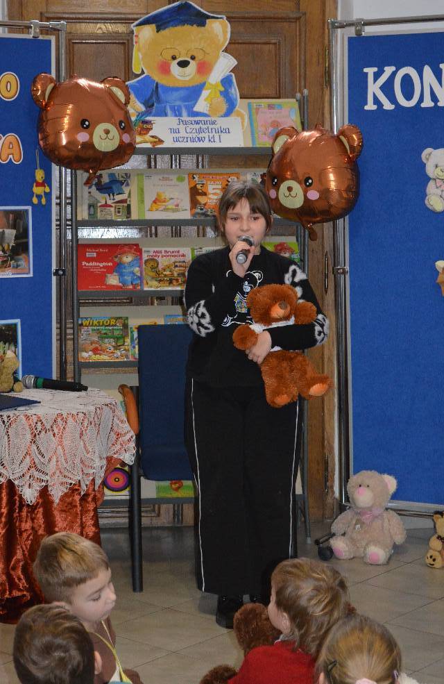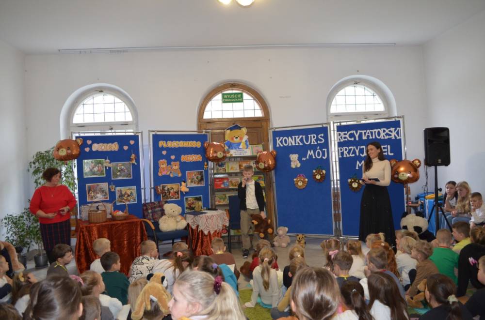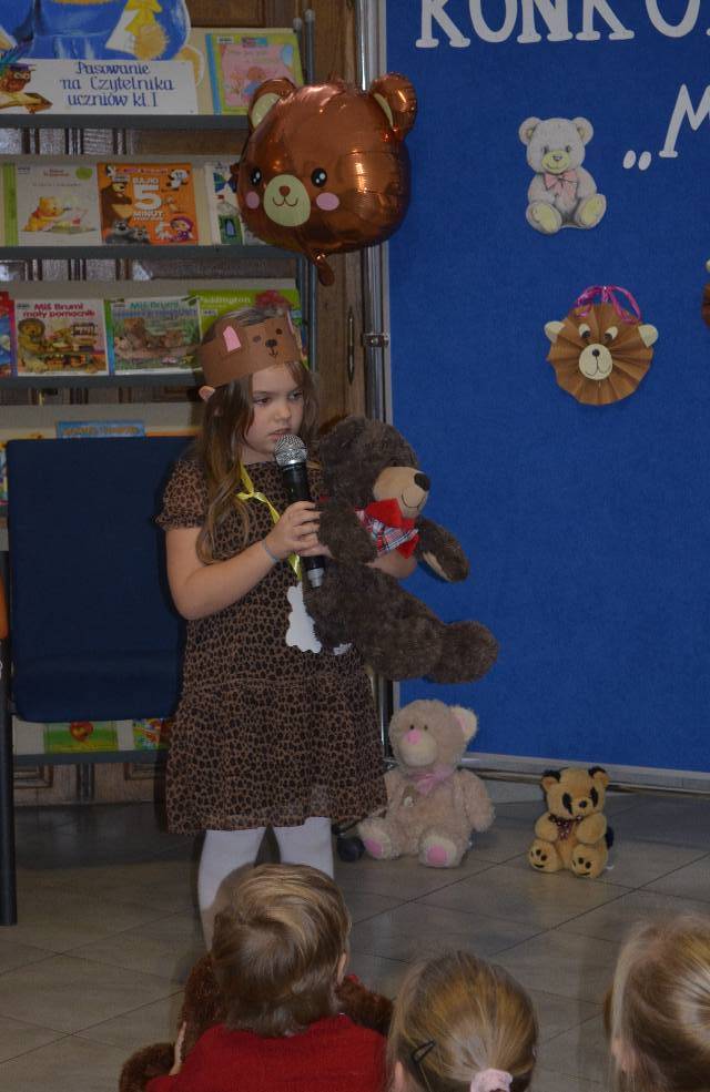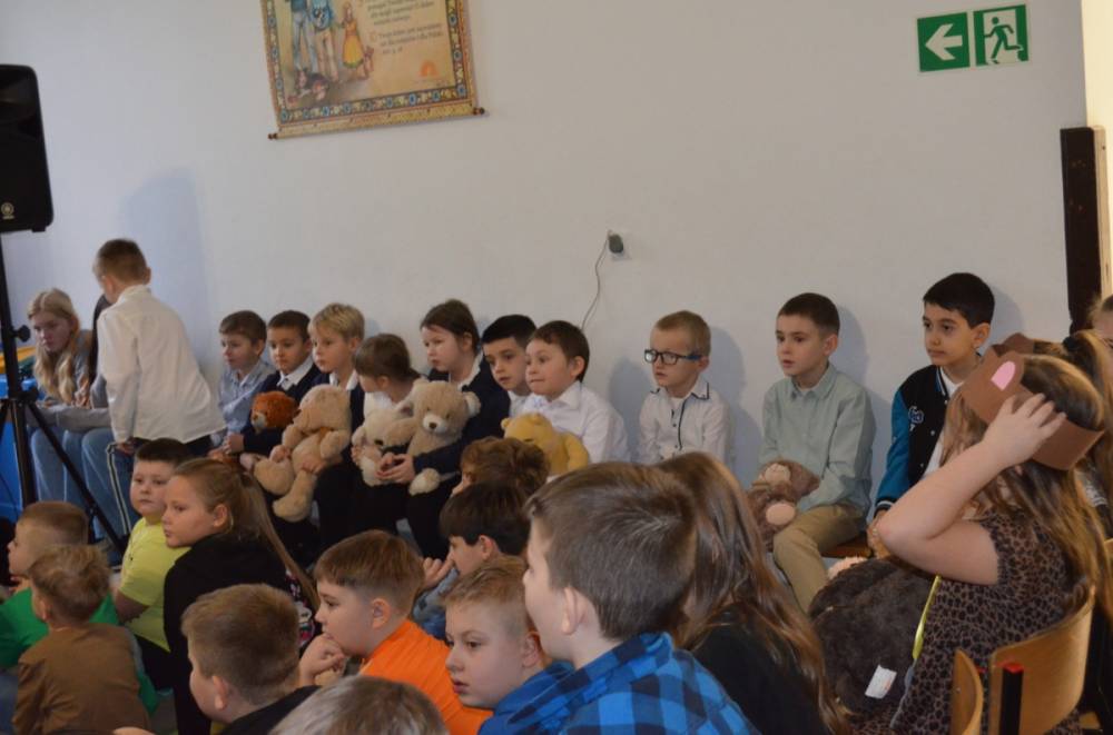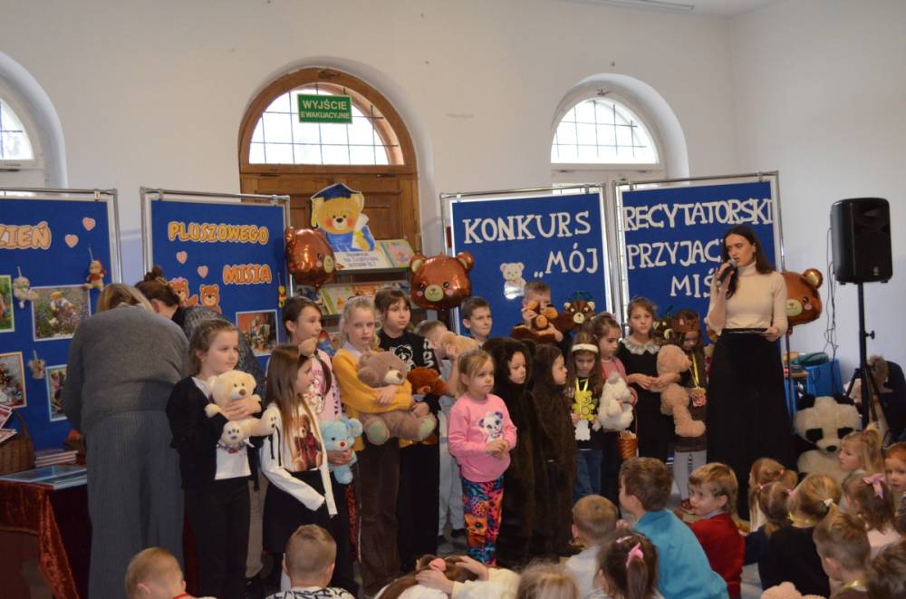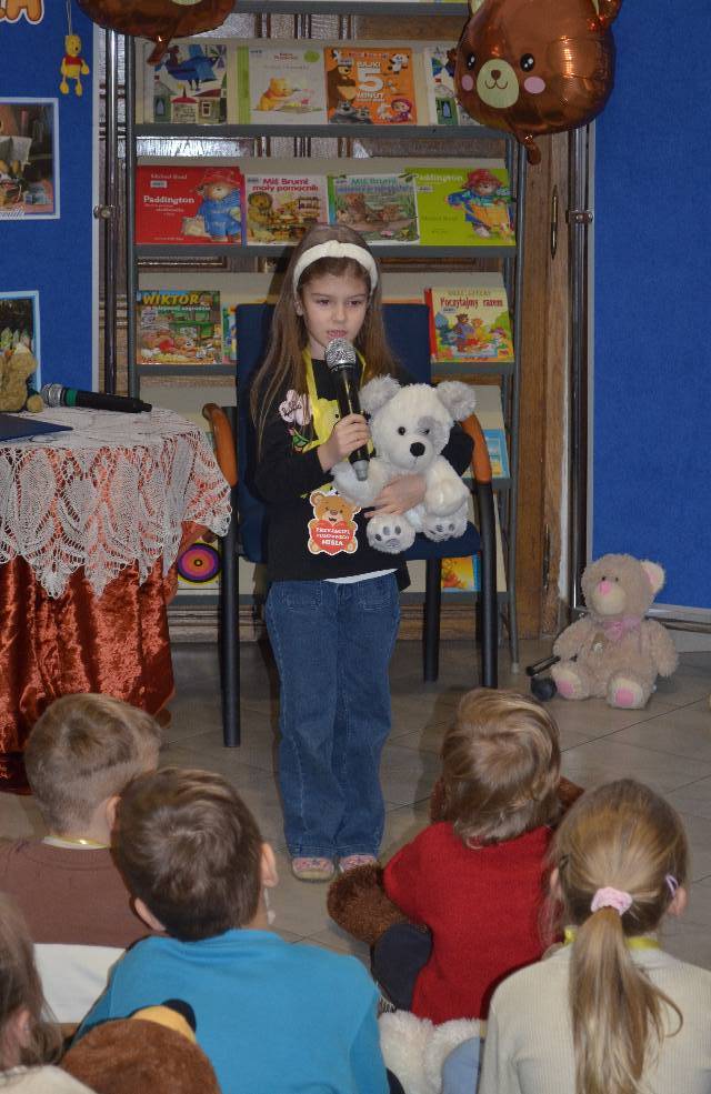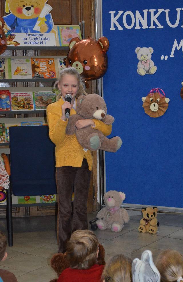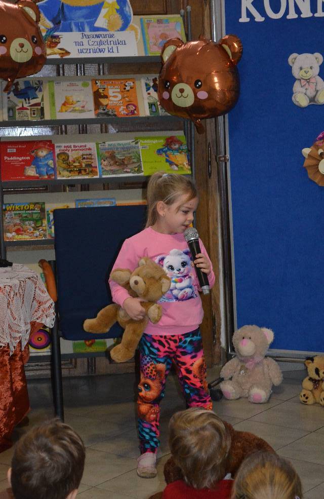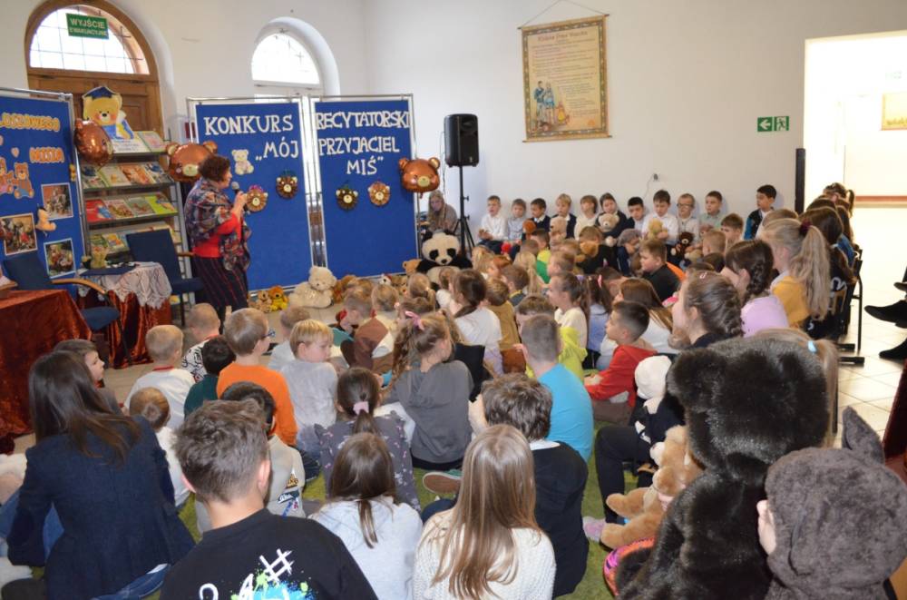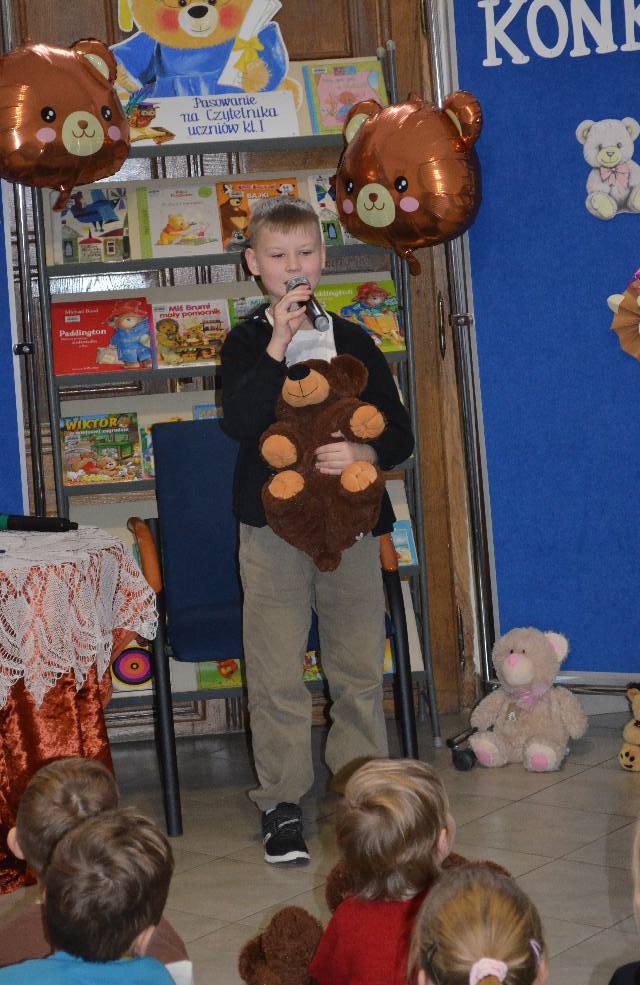 Dzieci z klas 0-3 i ich misie przybyły na świętowanie razem z Panią Dyrektor, Komisją Konkursową oraz swoimi Wychowawczyniami. Na początek wspólnie odśpiewano misiowy hymn „Pokochaj Pluszowego Misia”, następnie odbył się konkurs recytatorski pt. „Mój przyjaciel Miś”. Powołana komisja uważnie wysłuchała wszystkich występów i wybrała najlepsze.